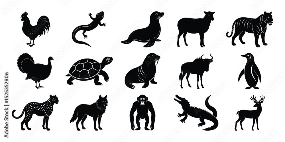 Fototapeta Vector Silhouettes of Diverse All Wild Animals, Birds, set and Reptiles on white