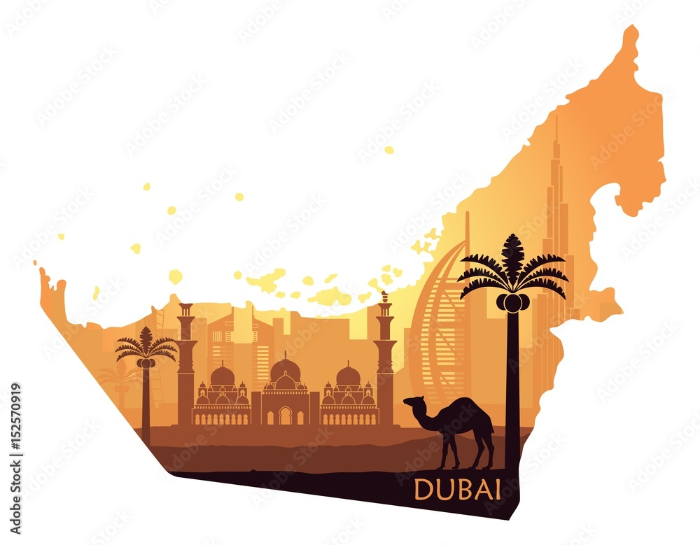Fototapeta Skyline of Dubai with camel in the form of a map of the United Arab Emirates