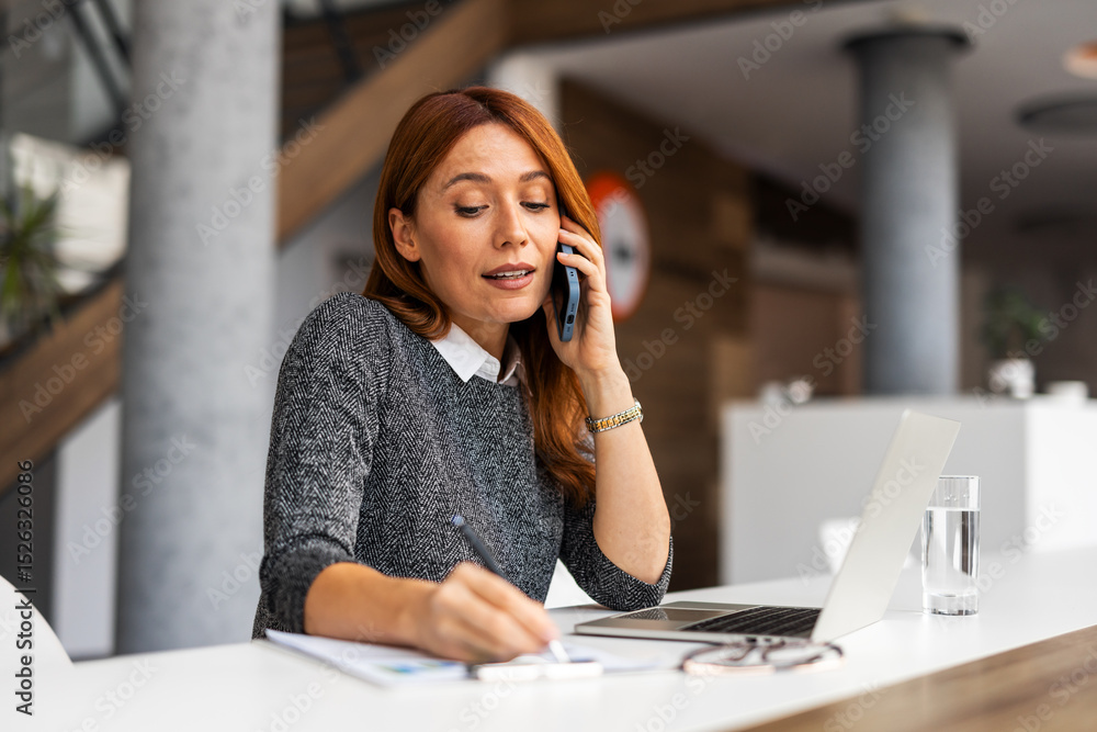 Fototapeta Professional Woman Multitasking While On a Phone Call in a Modern Office