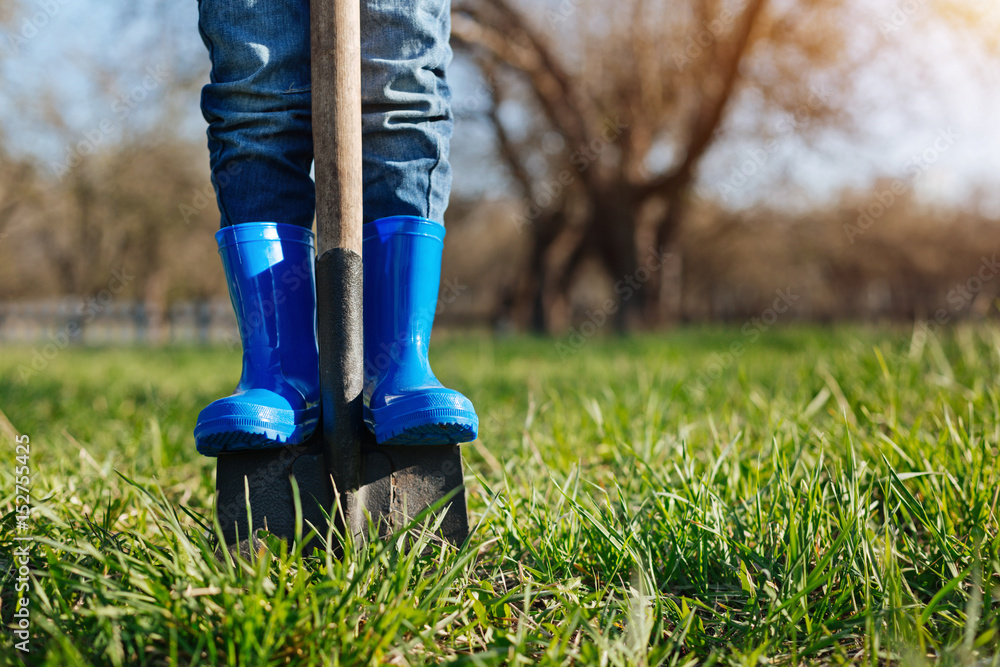 Fototapeta Close up of childs feet in rubber boots on shovel