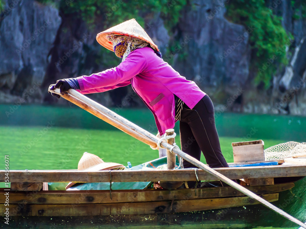 Fototapeta Traditional rower in vibrant purple ao dai dress and conical hat paddling wooden