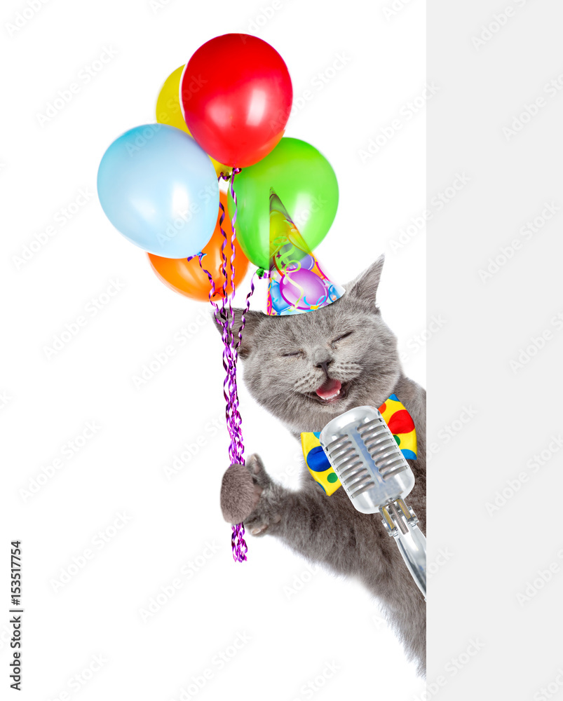 Fototapeta Cat in birthday hat holds retro microphone with balloons
