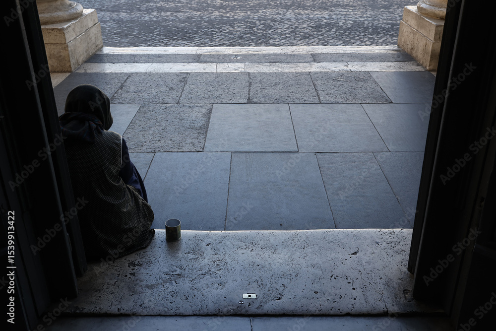Fototapeta Woman begging outside Santa Maria dei miracoli church, Rome, Italy