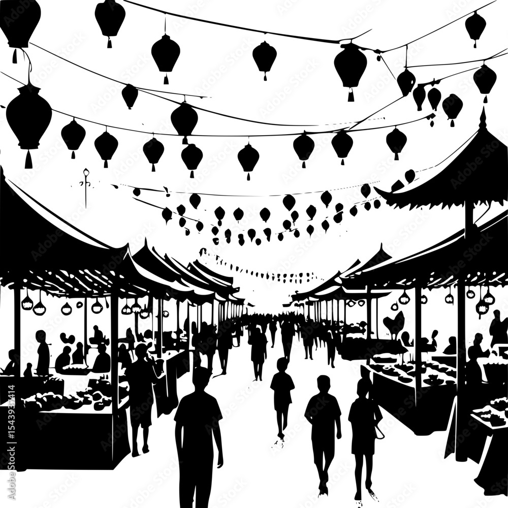 Fototapeta Night market silhouette with food stalls and lanterns in village square, lively