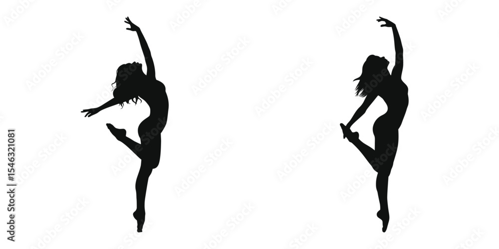 Fototapeta woman in one Hand on waist and one hand upward dance pose, Two dynamic silhouettes of female ballet dancers in mid-air poses, showcasing flexibility and athleticism