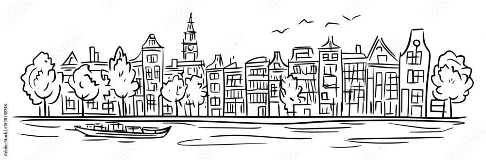 Fototapeta amsterdam canal houses and boat sketch