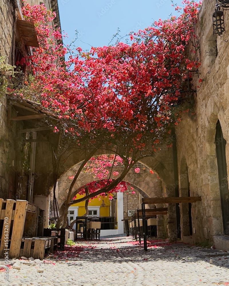 Fototapeta Enchanting stone walkway lined with pink bougainvillaea flowers, creating a char