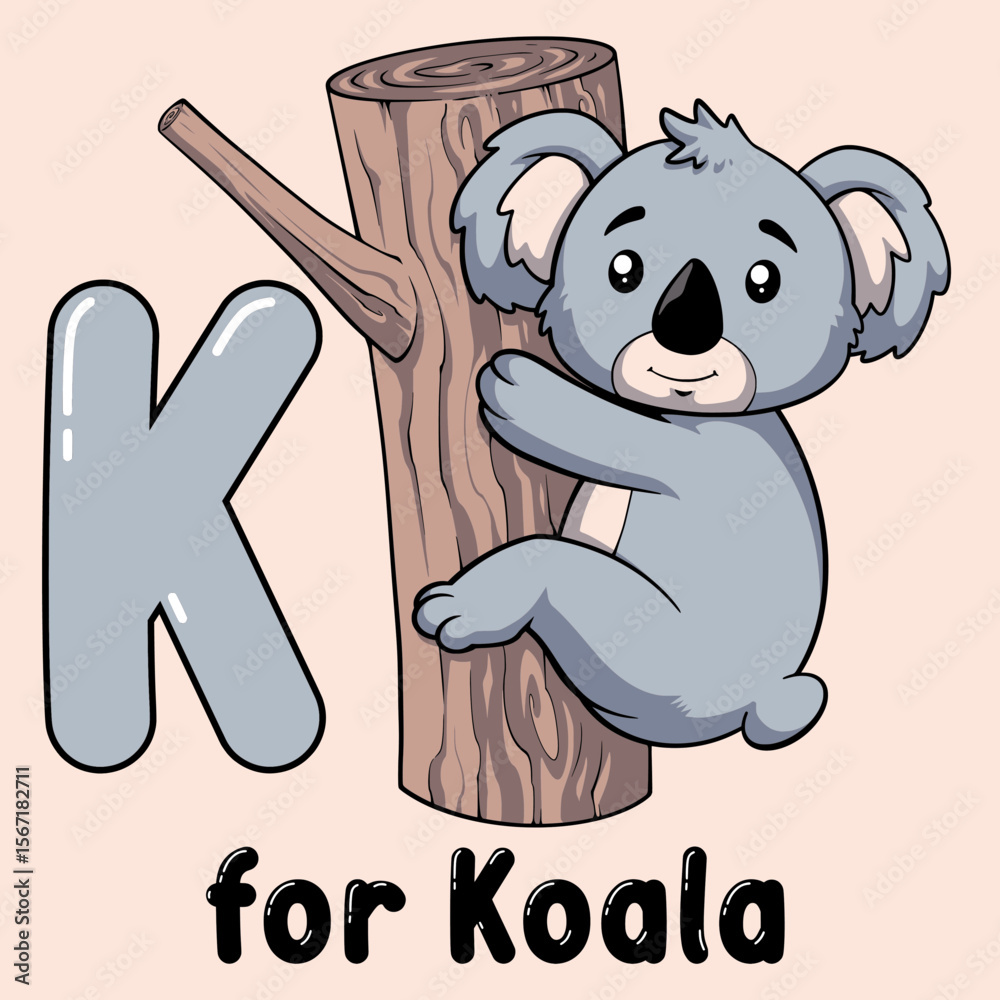 Fototapeta "Koala's Alphabet Adventure: A cute koala climbs a tree trunk next to a large letter 'K', embodying the essence of early childhood education and the alphabet