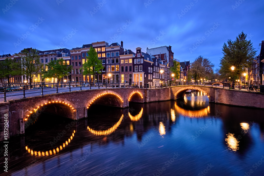 Fototapeta Amterdam canal, bridge and medieval houses in the evening