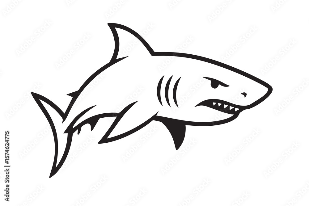 Fototapeta Vector illustration of a shark in black and white, featuring thick black outlines highlighting its pointed snout, dorsal fin, and powerful tail