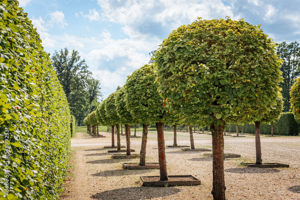 Fototapeta A row of uniformly trimmed trees lines a gravel pathway in a formal garden, casting shadows and creating a visually pleasing symmetrical pattern