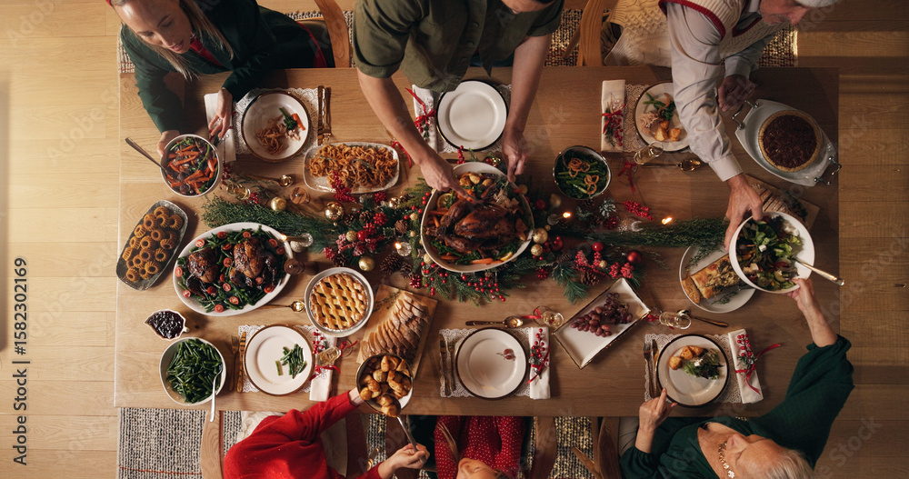 Fototapeta Festive, meal and people in home, dinner and celebration of Christmas with food at night or reunion