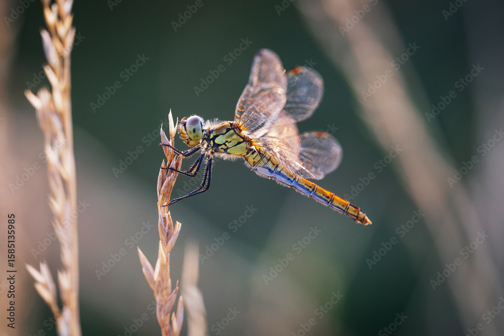 Fototapeta Jeune libellule sur un brin d'herbe sec avec la lumière soir