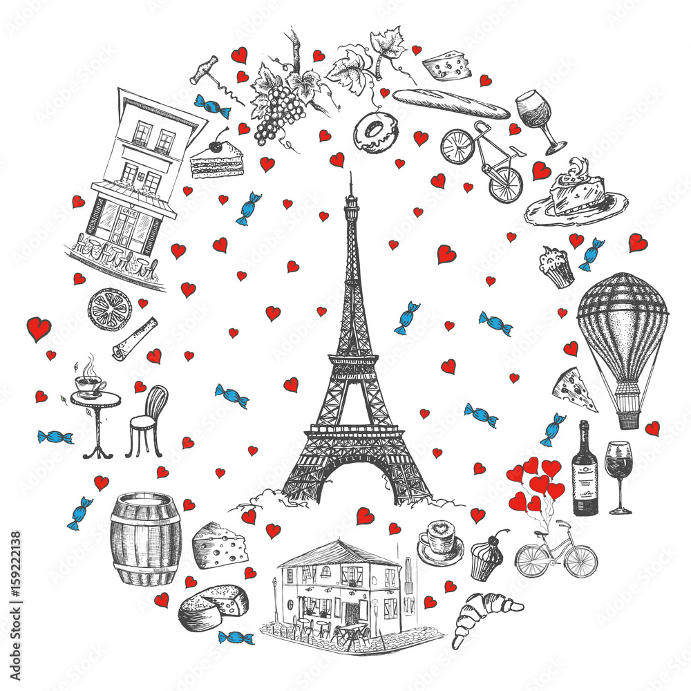 Fototapeta Set of hand drawn French icons, Paris sketch illustration