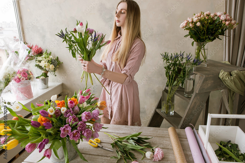 Fototapeta Professional florist decorator in flower shop compose new bouquet