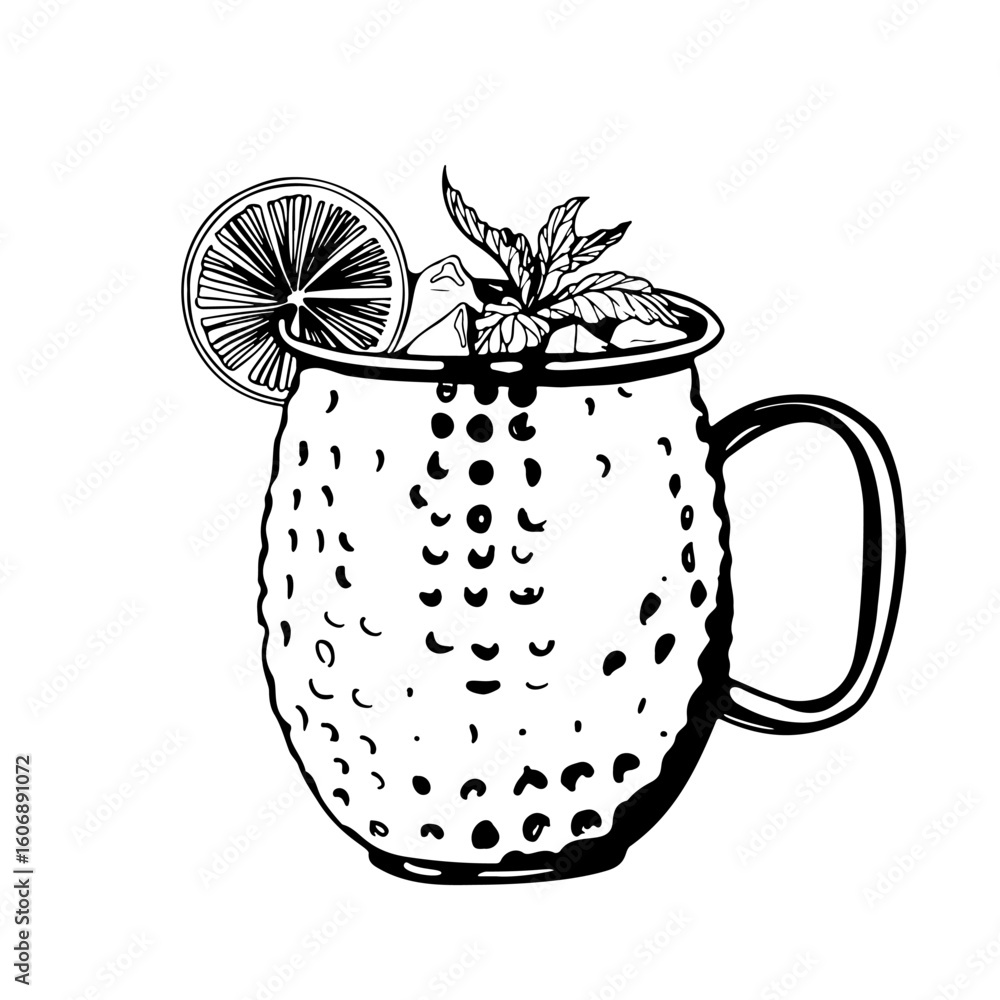 Fototapeta Hand drawn Moscow mule cocktail in copper mug with ice lemon slice and mint leav