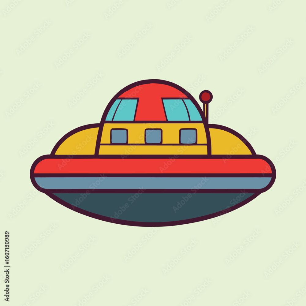 Fototapeta Colorful retro cartoon vector illustration of a flying saucer on light green bac