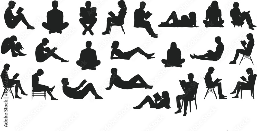 Fototapeta A diverse set of people reading books in various seated and reclining poses, isolated black silhouettes for education or library themes, cad drawing flat vector illustration