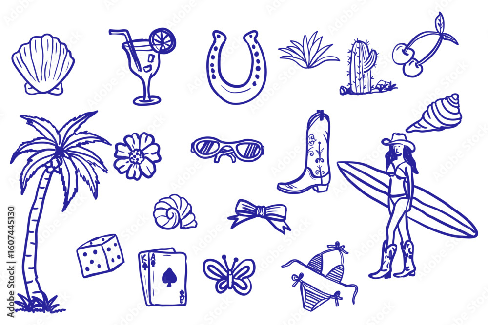 Fototapeta Whimsical coastal cowgirl doodle hand drawn collection design.