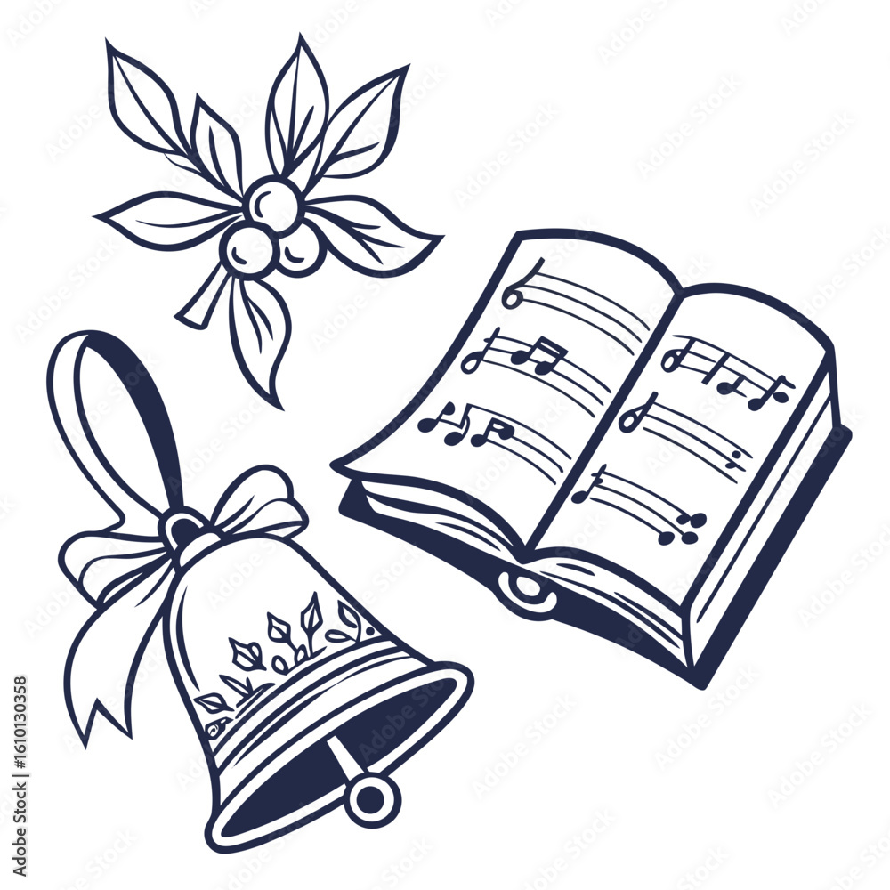 Fototapeta Festive bell and hymn book with holly ribbon leaves