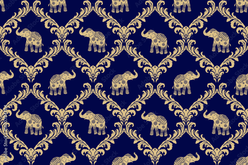 Fototapeta Elegant Golden Flora with elephant damask seamless pattern