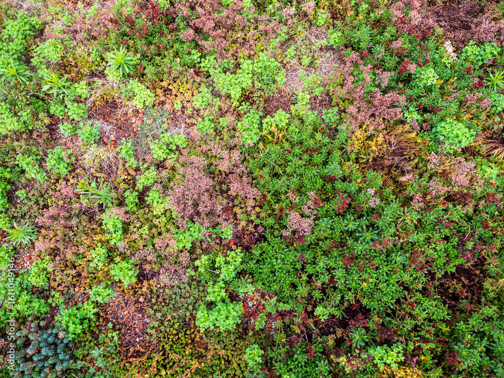Fototapeta Top view of colorful ground cover plants including sedum and succulents in a dense natural pattern, ideal for green roofs or dry gardens