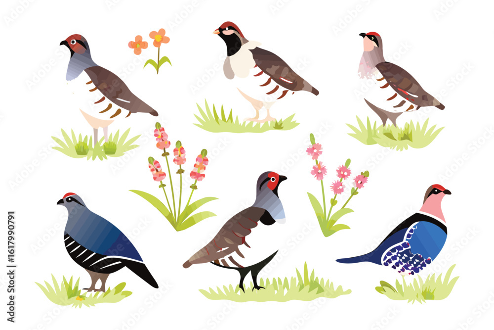 Fototapeta Partridge in the meadow: A vibrant collection of partridge illustrations set amongst simple plant illustrations and green grass