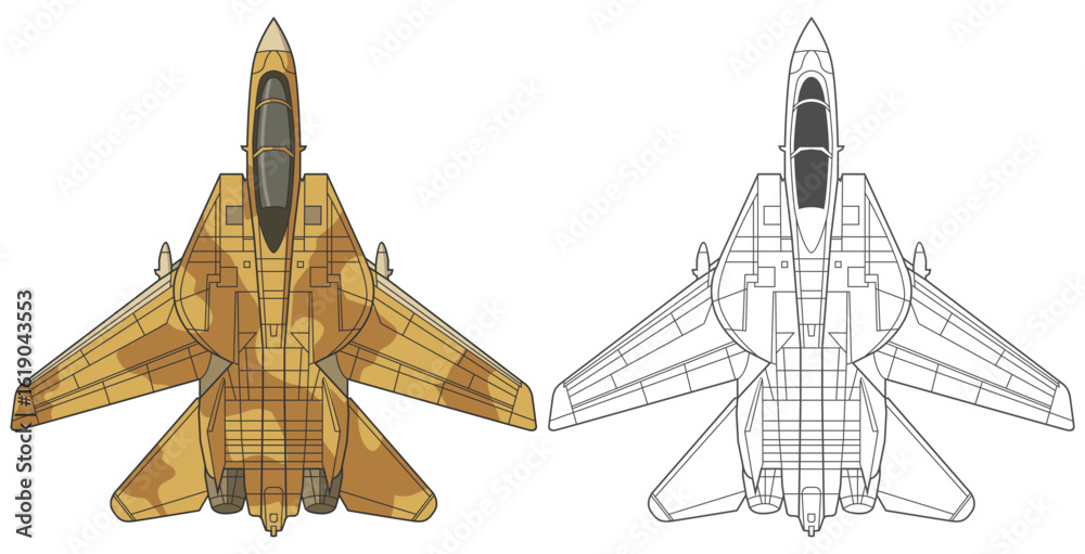 Fototapeta Set F-14 tomcat military aircraft design in line art and colored style from top view