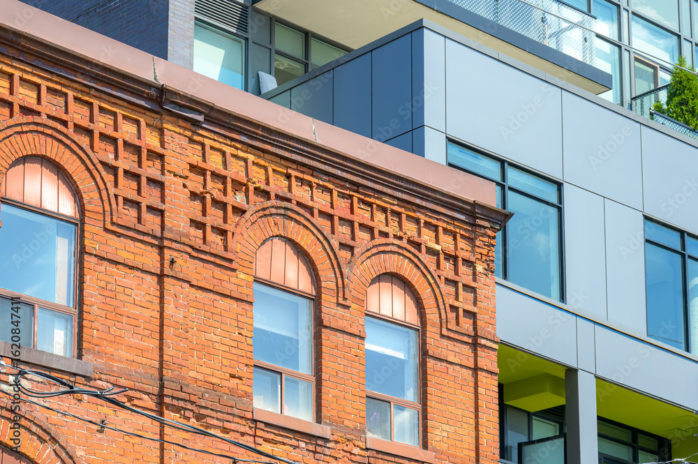 Fototapeta A heritage brick facade with arched windows stands in contrast to the sleek glas