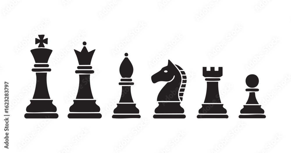 Fototapeta Black and white illustration of chess pieces king queen bishop knight rook pawn