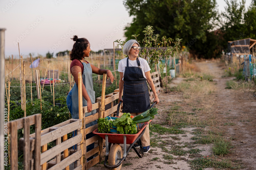 Fototapeta Farmers carrying fresh vegetables in wheelbarrow at sunset in allotment