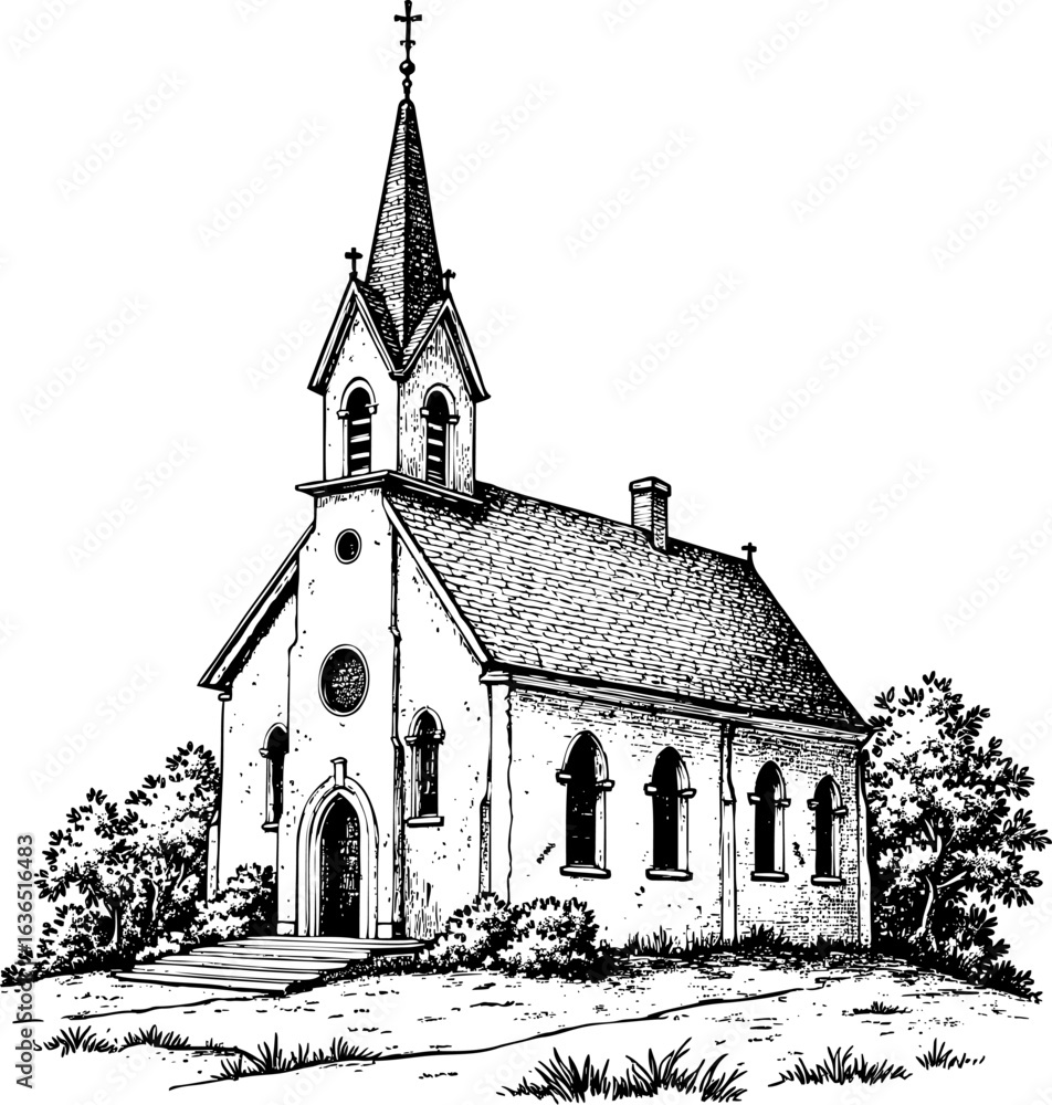 Fototapeta Black and white sketch of a wooden church with tall steeple and cross