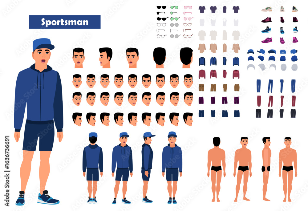 Fototapeta Cartoon 2d man character constructor sets for full body and head rigging design
