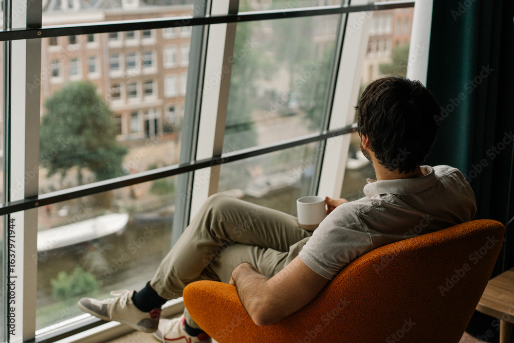 Fototapeta man drinking coffee in a chair with attic window and view on Amsterdam