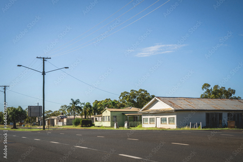 Fototapeta A long row of modest, low-slung buildings with corrugated metal roofs lines a quiet street under a clear, blue sky with high, thin clouds