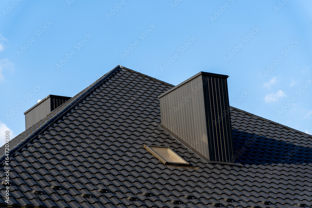 Fototapeta Close-up view of a dark metal roof with two chimneys, including one modern style