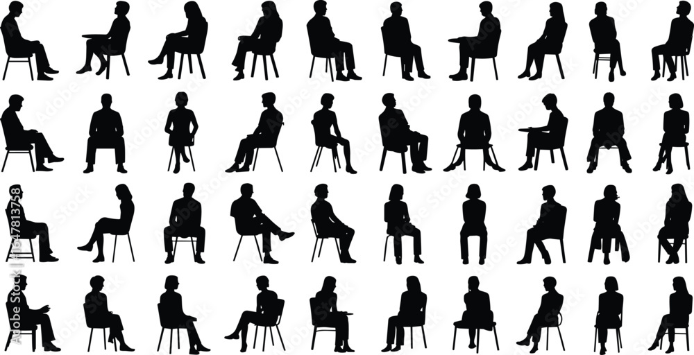 Fototapeta Silhouette collection of people sitting on chairs in various poses, black human