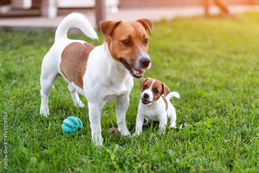 Fototapeta Jack russell dogs playing on grass meadow