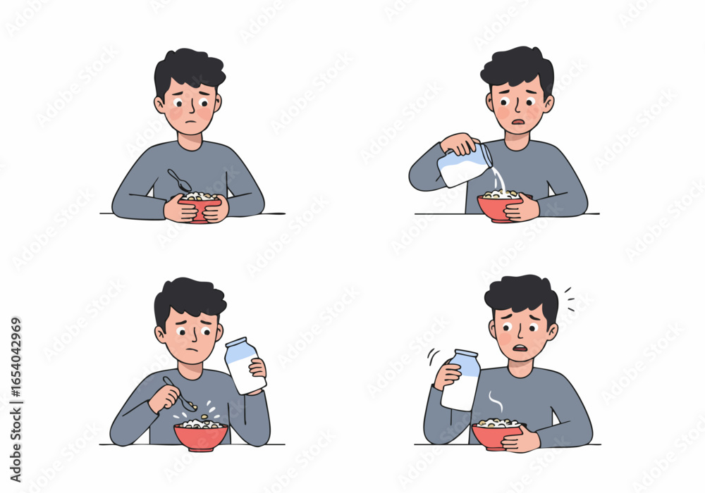 Fototapeta Man discovers his milk is spoiled while preparing breakfast cereal, showing a sequence of disappointment and disgust