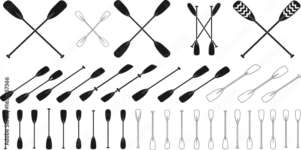 Fototapeta Black and white vector collection of paddles and oars for canoe, kayak, rowing,