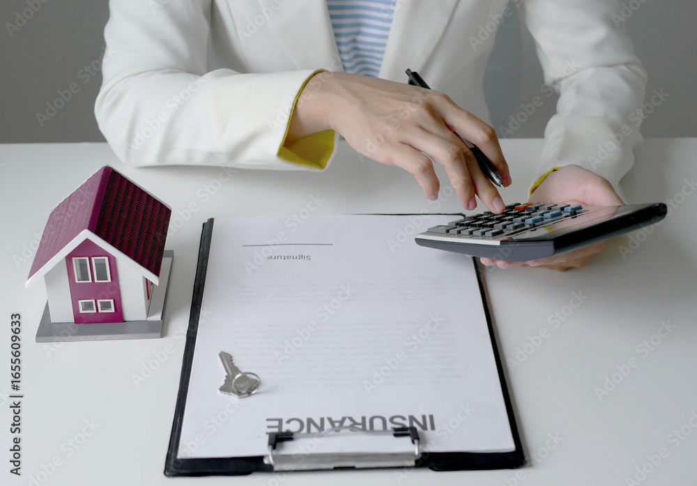 Fototapeta Real estate agents give advice to clients and calculate home ren