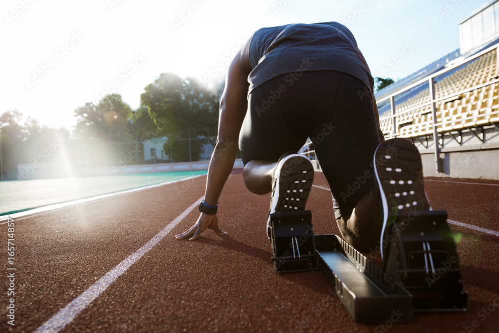Fototapeta Back view of a young man in starting position for running