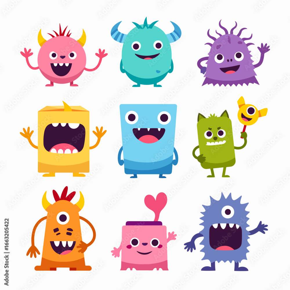 Fototapeta Cartoon monsters set, cute colorful fantasy creatures, funny characters with uni