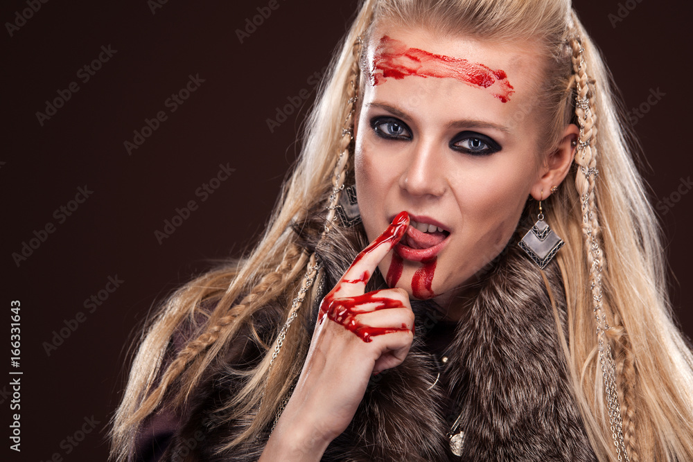 Fototapeta Portrait of viking woman in a traditional warrior clothes