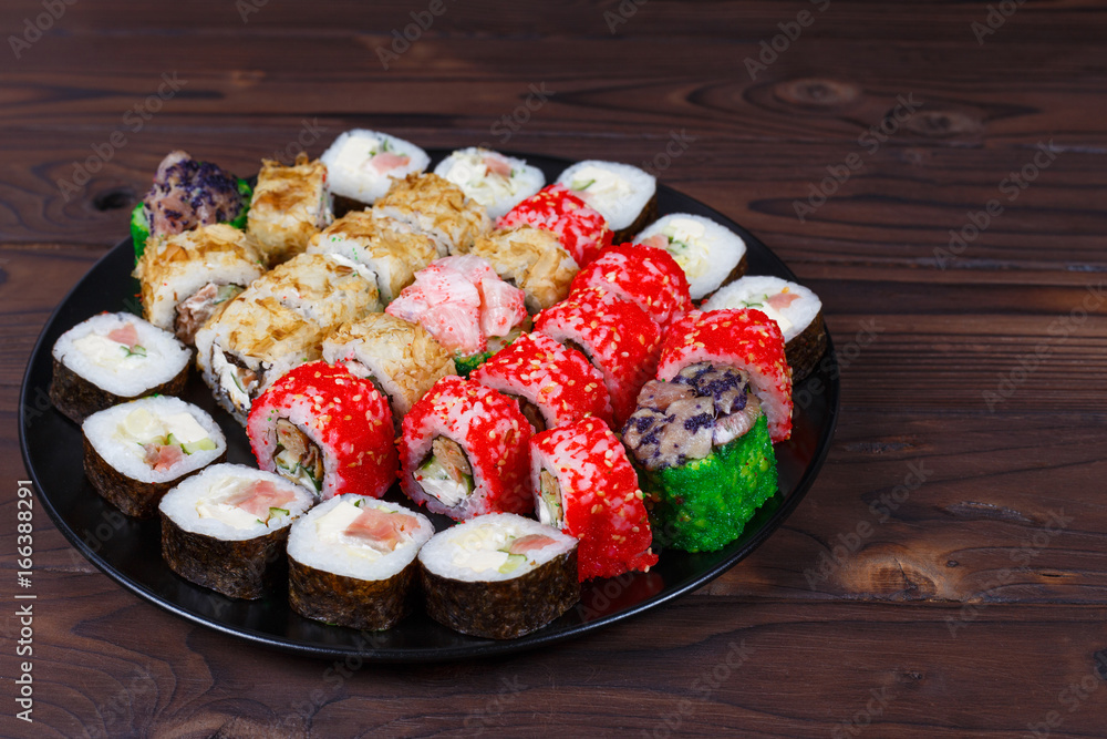 Fototapeta Colorful set of japanese sushi maki rolls with salmon, tuna and avocado served o