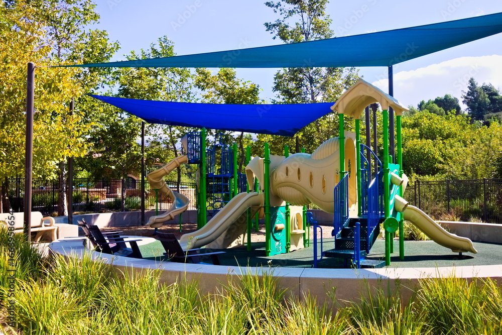 Fototapeta Colorful playground in Corona, California, featuring slides, shade covers, and play structures surrounded by trees in a sunny, family-friendly park setting