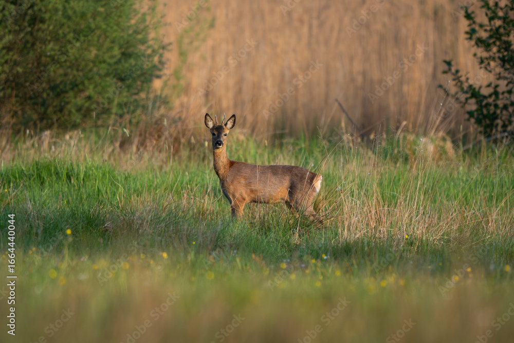 Fototapeta European roe deer buck standing alert in spring meadow