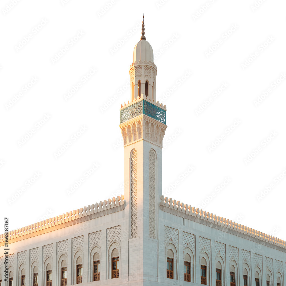 Fototapeta Serene Mosque Corner: Warm Sunrise Light, Intricate Architectural Detail, Islamic Design, White Stone Facade