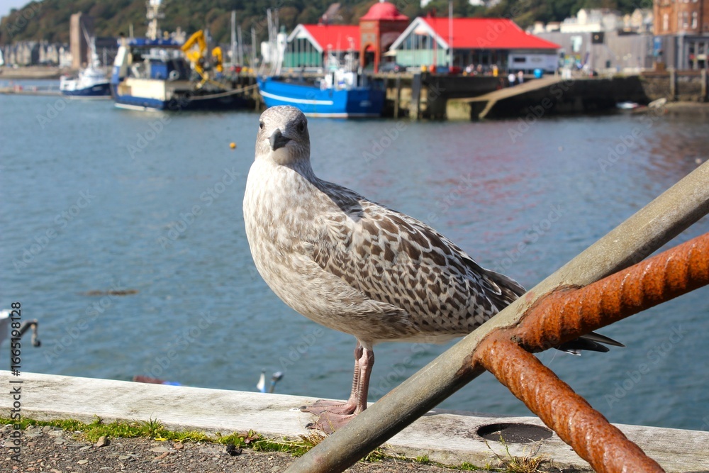 Fototapeta -Seagull standing on a concrete surface in the harbour on a summer day -Two meta