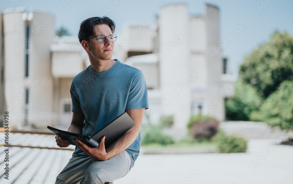 Fototapeta A pensive young adult in casual attire holding an open notebook outside near modern buildings